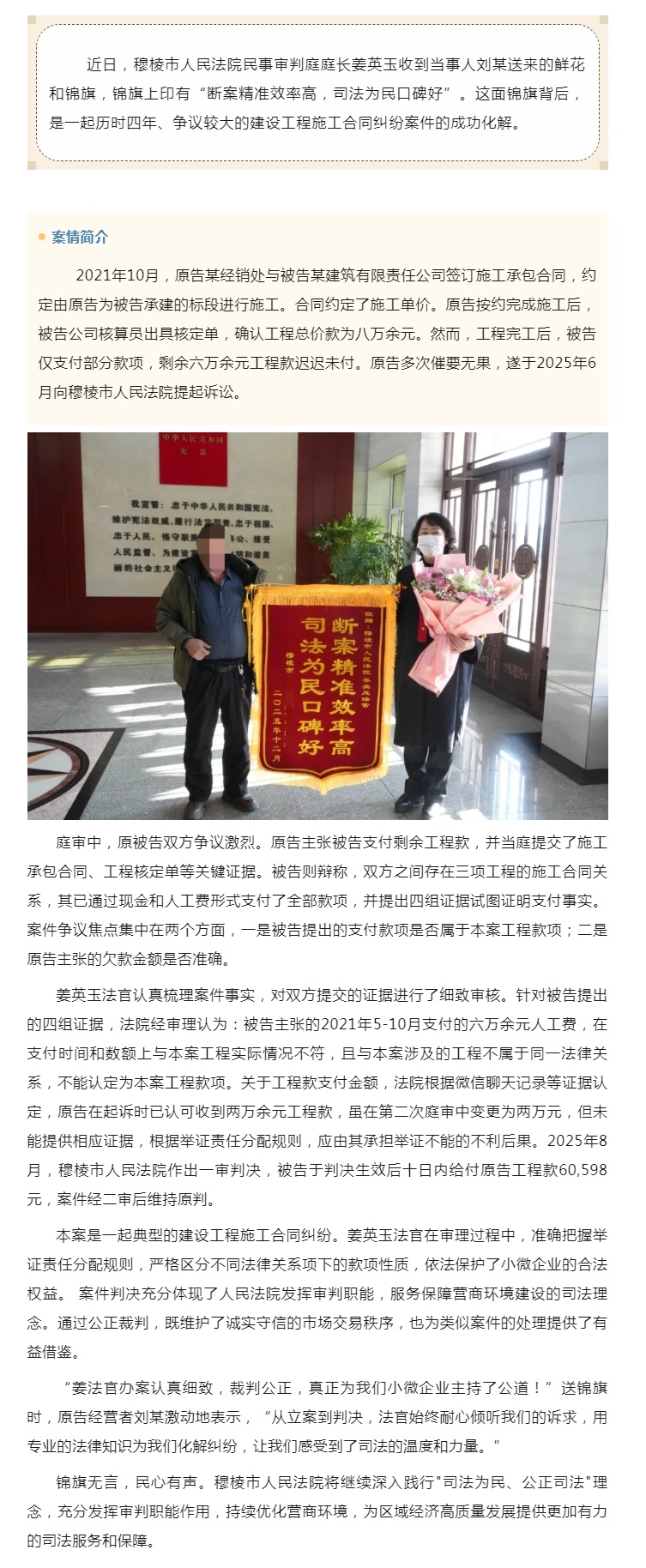 一笔四年旧账,一面崭新锦旗!穆棱法院为企业“算”出一本明白账